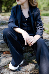 This premium suit is masterfully crafted from a high-quality linen blend, offering the perfect balance between the natural texture of linen and the durability of polyester. The set includes a tailored blazer, a matching vest with authentic wooden buttons, and trendy flared trousers. Whether for a wedding, a religious ceremony, or a high-end celebration, the Emma set ensures a polished and distinguished look.