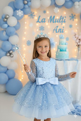 Handcrafted with meticulous care in our atelier, the Alis gown is designed for the most enchanting ceremonial moments. The bodice and elegant long sleeves are crafted from premium tulle, intricately overlaid with fine lace and hand-embroidered with shimmering sequins and pearls. This exquisite detail provides a multidimensional sparkle that catches the light beautifully with every movement. The airy tulle skirt completes the ethereal silhouette, making it a perfect choice for cooler seasons or formal indoor events. For your child's ultimate comfort, the interior is fully lined with 100% natural cotton, ensuring a soft, breathable, and skin-friendly feel throughout the celebration.