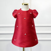 Handcrafted with artisan dedication in our atelier, the Casilda gown is a celebration of luxurious details. Tailored from premium red taffeta, the dress offers a majestic silhouette with a subtle, high-end luster. The neckline and bodice are meticulously adorned with hand-stitched pearls and precious crystal appliqués, creating a radiant effect that catches the light from every angle. Finished with our signature decorative bow, this dress is a premier choice for events that demand poise and grandeur. For ultimate comfort, the interior is fully lined with 100% natural cotton, ensuring a soft, breathable feel against your child's skin.